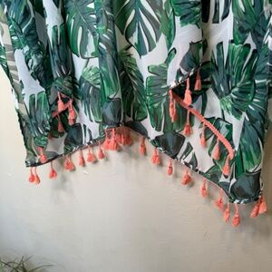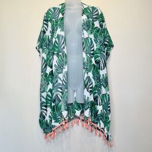Blogger Fave Monstera Palm Print Tropical Botanical Pattern Tassel Hemline Sheer Lightweight Open Front Cap Short Sleeve Swim Cover Beach Coverup Resortwear Vacation Vacay Spring Summer Pool Party Coastal Cardigan High Low Kimono