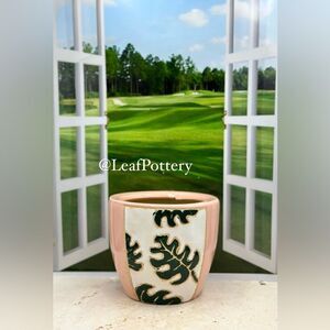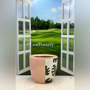 Dimensions: 5.5”H x 6”W, Opening 4.9”, weight 1lbs 9.5oz, Material: Ceramic, Drainage hole, Color: Pink , Green & White, Type: Barrel Planter, Made in Vietnam, Beautiful handcrafted monstera leaf , perfect for Indoor/Outdoor gardening, Don’t to dress up your plants 🪴