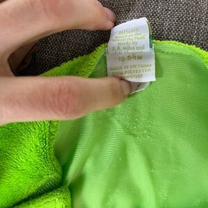 Soft lime green fabric from Disney Baby. The eye is plush, sticking out from the body. Velcro on shoulder makes convenient changing. Worn twice by my toddler, so good condition with some wear on it as pictured.