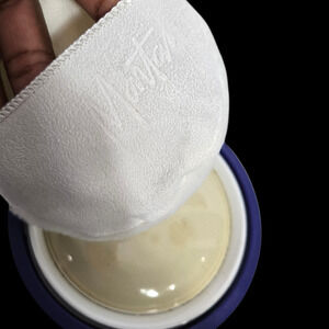 This large, luxurious compact is a stunning piece of vanity decor, featuring a creamy white lid with the beautiful script logo and a deep blue base.