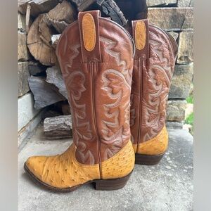 Montana Exotic Ostrich Tan & Brown Heeled Boots with Western Stitching Sz-7.5. P