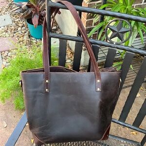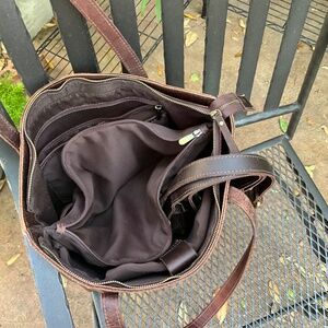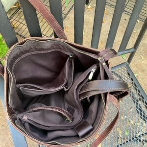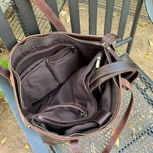 Genuine leather tote, great quality, lots of pockets, padded sleeve for up to a 15” laptop, used a few months-TOO BIG for me.