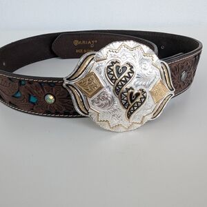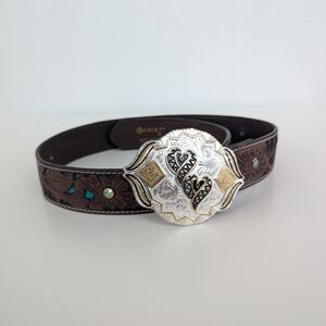 Elegant brown belt with intricate silver and gold heart buckle. Perfect for adding a touch of sophistication.