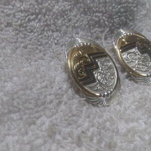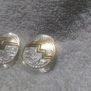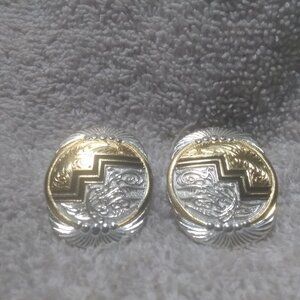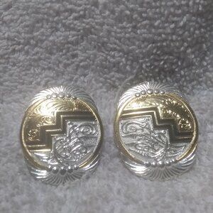 Up for sale is a Montana Silversmiths Large Oval Stud Earring Set Aztec Silver Gold Design Great
