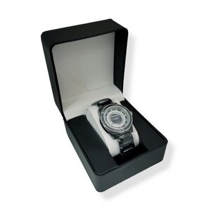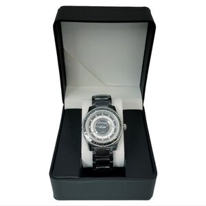 Montana Silversmiths Montana Time watch features a high gloss ceramic band in black, a black & silver face accented with clear crystals outside each number, and a bezel of square cut black crystals around the frame. New techniques in producing ceramics result in an extremely hard-wearing material. Ceramic watches are durable, lightweight, and comfortable to wear. Links may be removed to adjust size. Push button butterfly clasp. 40 mm case. 31 mm face. 30 meter water resistant. Ceramic 6.5" band