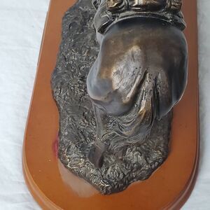 This detailed bronze-tone resin piece depicts a cowboy kneeling in prayer, holding his hat, with his saddled horse standing faithfully at his side. Mounted on a polished wood base with a brass title plaque, it represents the strength, faith, and respect of those who shaped the West.