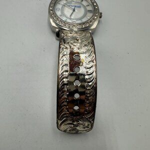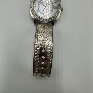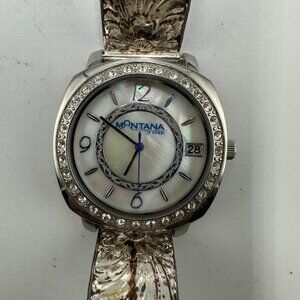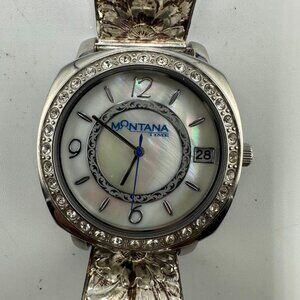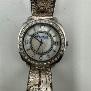 Montana Time Watch Women Silver Tone Mother of Pearl Dial Scroll Design Band