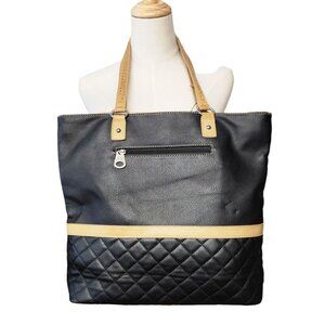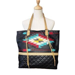 Montana West tote or handbag. Black faux leather with multicolor embroidered Aztec design on one side. Tan braided double straps and fringe with two silver tone and turquoise charms. Silver studs across front. Two large interior compartments, one with zipper, one with snap. Several smaller compartments inside and one small zipper compartment on outside. Approximately 17" x 14" x 4". New with tags.