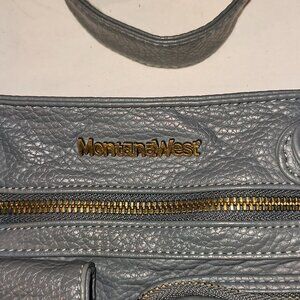 Amazing leather purse! Color is a blue-ish Gray in very soft, yet durable leather. The exterior has 4 zippered pockets and 1 snap pocket. There is an adjustable over the shoulder/crossbody strap adorned with buckle and tassels. The main compartment has 1 zippered pocket and 2 slip in pockets. 10H x 9W