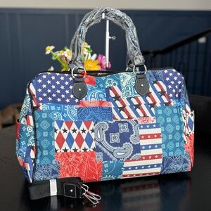 PU leather (distressed color) Belt buckle on the flap with magentic closure Floral tooling Accented with multi antique silver rivets and daisy concho Front slide pocket A zipper enclosure for the entire purse Inside single compartment divided by a medium zippered pocket Inside of bag include a zippered pocket and 2 open pockets A zippered pocket and open pocket on the back Double adjustable straps 11" X 5" X 11" (Drop Top handble : 4") matching wallet included!