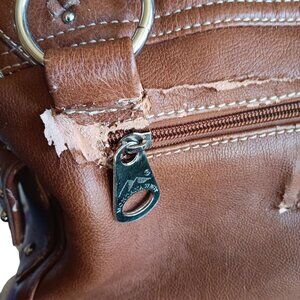 Noticeable wear and tear on the back zipper area, with peeling and fraying material.
