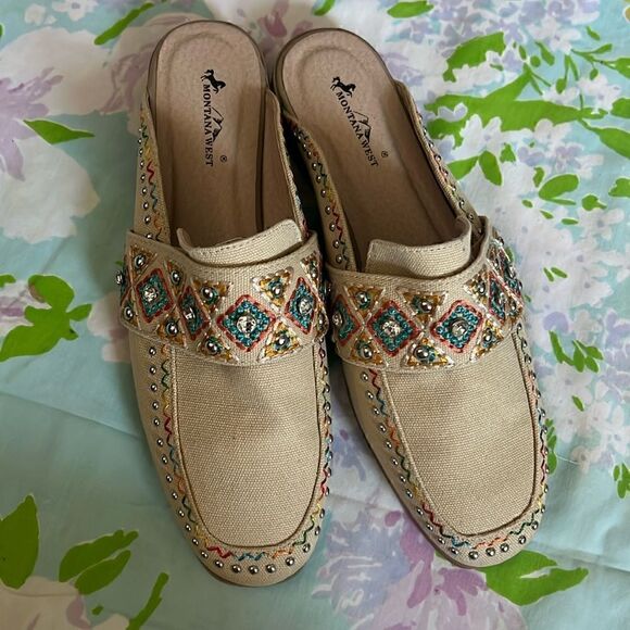 Montana West Mules Slides Canvas Rhinestone Embroidered