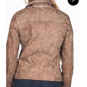 A classic silhouette gets a contemporary update with on trend lace up side details and a distressed leather look. Featuring premium quality distressed wash vegan leather, quilting details, lace up sides, a pointed shirt style collar, and vertical front pockets. Be prepared for plenty of compliments when you wear this unique jacket.