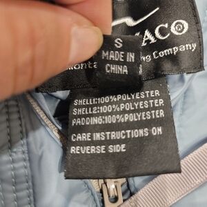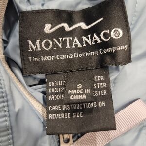 Montanaco reversible puffer vest in excellent condition. Side pockets. Collared. Front zipper closure. RN 110464. Color - Light Blue/Gray/Pink. Size - S.