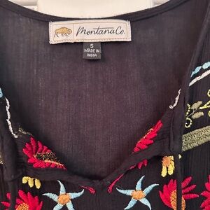 Elevate your wardrobe with this elegant black blouse from Andree by Unit, featuring intricate and colorful embroidery. Ideal for any occasion.