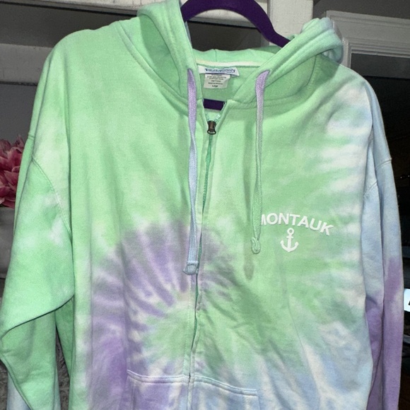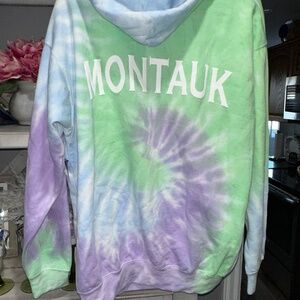 Has the word MONTAUK with an anchor under it on the front left side and the word MONTAUK across the back (See Pic).