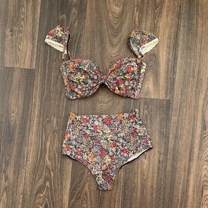 Stylish cream bikini set. Features ribbed texture. Off-shoulder top with bow detail. High-waisted bottoms.