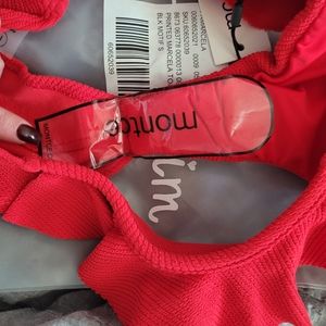Uno bottom with a ruffle on the side! Super cute, flattering and comfortable, and most importantly will not cut in. Nylon/ Spandex blend