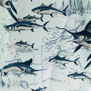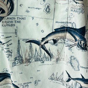 Monte Carlo Brand Men's Hawaiian Style Button Down Shirt. The print is Marlin and Tuna fish on a blue background map of the South Pacific Ocean, St Martin, Dominica, St Augustine etc. Men's Small 34-36