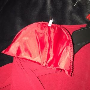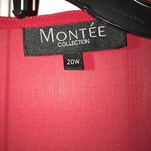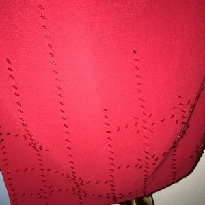 This is a size 20W Montée Collection Red sheer “fancy” jacket. This could be worn to dress up a dress or even to work. This also has shoulder pads but they are easily able to be removed. This also has a small clasp in front and beaded details.