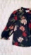 Made in Vietnam. Shell 1/2: 100% Polyester. Lining: 100% Polyester. High neckline. Semi sheer. Flowy. Top of blouse and sleeves are sheer. Body of blouse is lined. 3/4 length sleeves. Black pullover blouse with floral pattern. Brand is monteau Los Angeles.