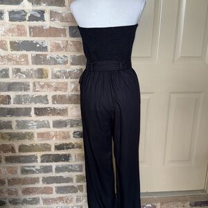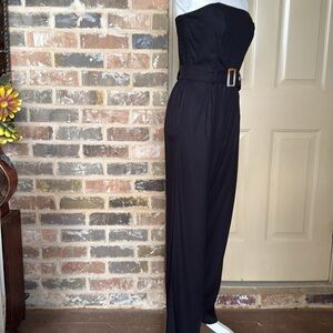 Monteau Black Strapless Jumpsuit Belted Linen Blend Wide-Leg Palazzo Style Sz M