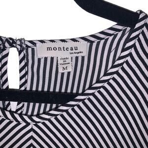 Add a touch of playful charm to your wardrobe with this adorable medium size Monteau top! Featuring a classic black and white striped pattern, this top is elevated by sweet ruffle sleeves and a trendy tie-front detail. The lightweight fabric ensures a comfortable fit, perfect for warm days or layering under a jacket. Dress it up with a skirt and heels or keep it casual with jeans and sandals. This versatile top is a must-have for any fashion-forward woman's closet! In excellent condition and ready to wear.