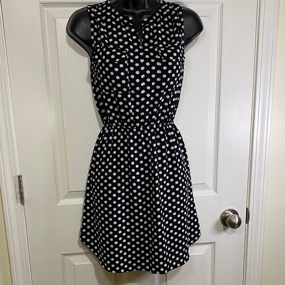 Chic and timeless, this Monteau black and white polka dot dress is perfect for any occasion. Features a flattering A-line silhouette with a sleeveless design, lined skirt, elastic waist and classic round neckline with a slight V. Lightweight and comfortable, it’s ideal for warm weather, work events, or casual outings. Size Large. Versatile and easy to dress up or down.
