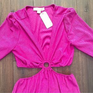NWT Monteau Bright Pink Cutout Cropped Deep V-Neck Long Sleeve Midi Dress. Keyhole waistline. Open back. Size Jr. M.