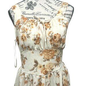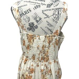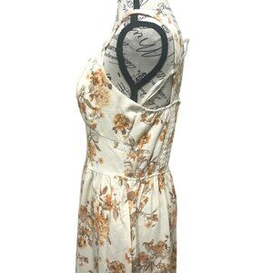 Monteau Los Angeles cream floral maxi dress. This sleeveless dress features a warm brown floral motif over a soft cream base. Designed with a scoop neckline, fitted bodice, and full-length skirt.