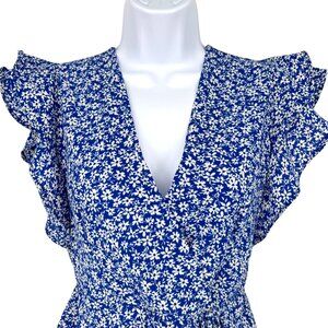 Monteau Floral Ruffle Sleeve Wrap Peplum Blouse Blue White Size Small
