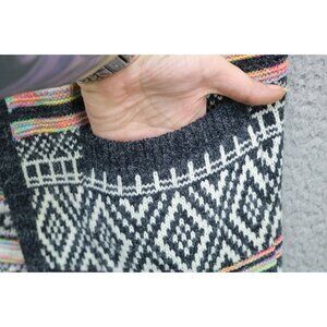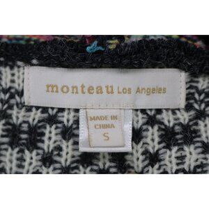 Monteau LA Aztec Long Hooded Open Cardigan-Size Small-Pockets. Item is in Great Condition. The material is 85% Acrylic and 15% Nylon. Laying flat measuring armpit to armpit it is 22'' and 33'' in length.