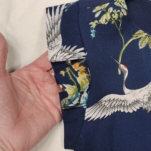 Stylish blue top featuring crane and floral print. Perfect for casual wear.