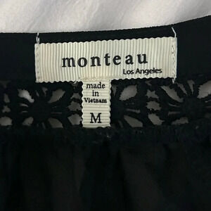 Vintage Monteau dressy top, size medium lace bordered neckline, flounce sleeve with matching lace, open back with two buttons, formal in a risqué way, armpit to armpit 19” length from shoulder down 23”. Loose flowing fit, raglan sleeves. This is an amazing eye catcher