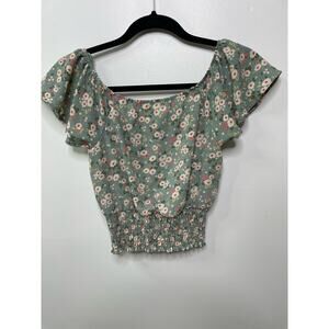 Monteau Los Angeles Floral Print Smocked Cropped Top Blouse Olive Women's Small