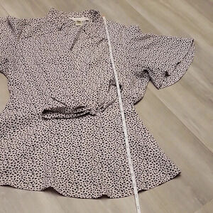 Monteau Los Angeles Faux Wrap Pink Black Peplum Flutter Sleeve Top Womens Size M