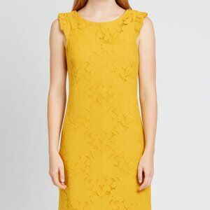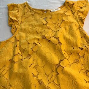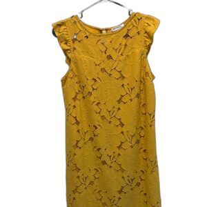 Monteau Los Angeles - fully lined lace dress. Mustard Yellow. Size Small. Ruffle Cap Sleeve. One button with keyhole closure on back. Shell is 70% cotton, 30% nylon. Lining is 100% polyester. Round neckline. Approx. measurements: pit to pit 17", shoulder to bottom hem 33". Excellent preowned condition. No flaws, rips, stains.