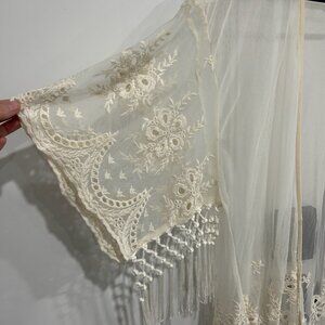 Sheer lace kimono cardigan with intricate embroidery and tassel details. Lightweight and ideal for layering. Hand wash cold.