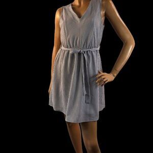 Monteau Los Angeles Short Dress Size Medium Blue White Stripe Bowtie Belt Dress
