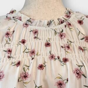 This Montreau Los Angeles blouse features a white background with a pattern of small pink flowers. The blouse has a ruffled neckline and short, ruffled cap sleeves. The bodice has a smocked design lending to a cottagecore aesthetic.