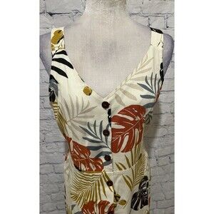 The Monteau Los Angeles women's rayon and linen tropical sleeveless midi dress in size large is a stylish and versatile piece perfect for various occasions. The dress features a beautiful floral pattern, a flattering v-neckline, and a button closure for added style. Made from a blend of rayon and linen, this dress is lightweight and comfortable, making it ideal for travel, casual outings, or even workwear during the warmer seasons of summer and spring. The tropical theme adds a touch of vibrant color and character to the overall design, making it a must-have for any fashion-forward woman's wardrobe. 19 inches pit to pit, 32 inch waist and 41 inches long. Smoke free home.