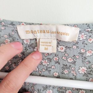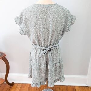 Monteau Los Angeles Floral dress. Mint green above the knee dress with ditsy floral print. Surplice wrap style neck line and waist tie. Flutter sleeves and ruffle hem.