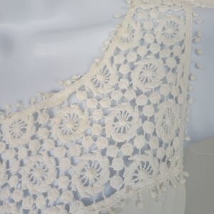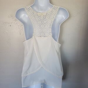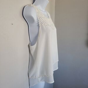 Monteau Medium White Chiffon Tank Top Racerback Lace Neck Back Pom Pom Trim