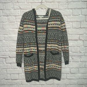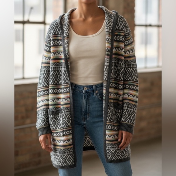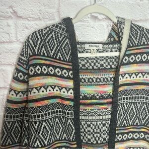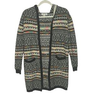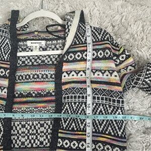 This Monteau cardigan features a classic multicolor color scheme with a cozy hooded design. The open-front style and long sleeves make it perfect for layering during cooler months. Its mid-thigh length adds a touch of elegance to any outfit.