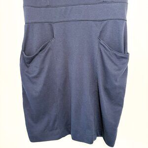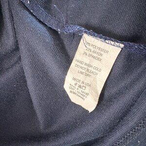 This navy dress by Monteau offers a polished and timeless look with its tailored shape and clean lines. Crafted in the USA from a soft and stretchy blend, it features a back zipper closure and a flattering knee-length cut—perfect for work, dinners, or casual events.