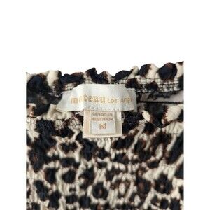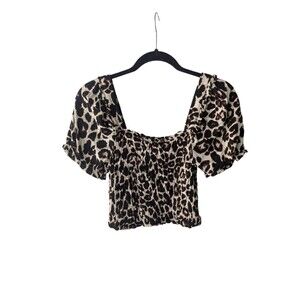 Monteau Puff Sleeve Smocked Crop Top Women's Size Med Leopard Print Linen Blend
