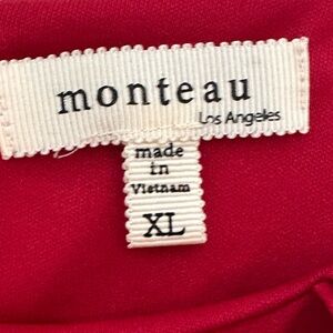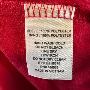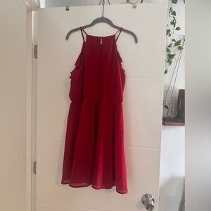 Charming red dress with ruffle details. Sleeveless design. Perfect for formal events.