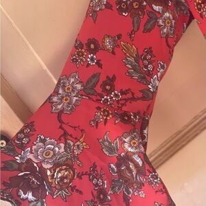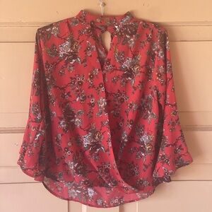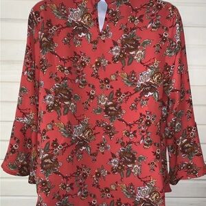 This elegant Monteau blouse showcases a relaxed wrap design with 3/4 length bell sleeves and a keyhole collar. The vibrant red base is beautifully complemented by gray accents, making it a versatile choice for various occasions. NWOT
