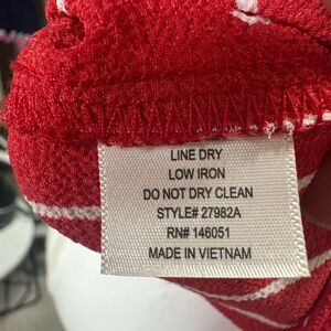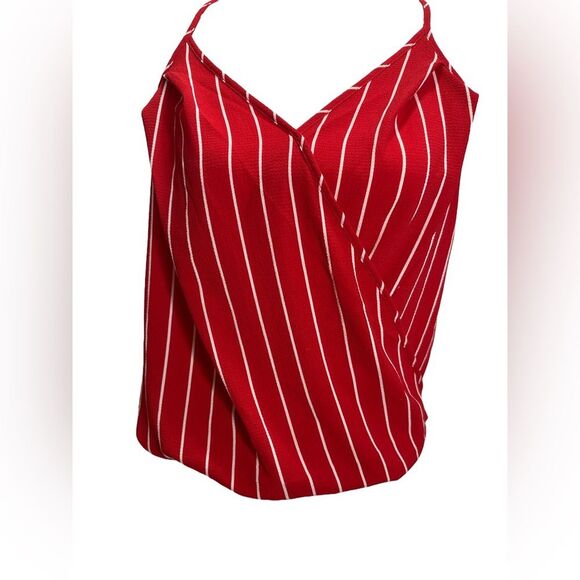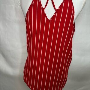 Beautiful red and white striped spaghetti strap tank featuring a criss cross front and detailed back makes this a must for summer! Cropped in front with a lower hem at the back.