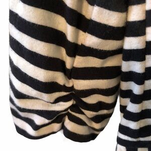 Black and off-white striped blazer with sing button closure, two front pockets, four button detailing on sleeves, some piling.